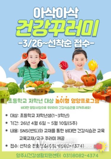 양주시는 오는 4월 6일부터 보건소 건강생활지원센터에서 초등학교 저학년을 대상으로 비대면 놀이형 영양프로그램 ‘아삭아삭 건강꾸러미’를 운영한다.