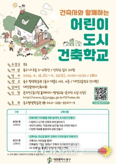 뉴스펀치 이현승 기자 | 대전 중구는 오는 26일부터 미래 세대를 위한‘어린이 도시건축학교’수강생을 모집한다고 밝혔다.