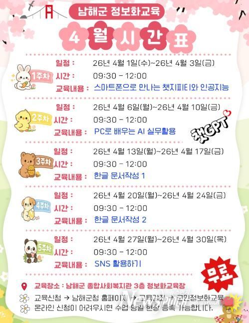 이번 교육은 남해군 종합사회복지관 3층 정보화교육장에서 실시되며, △스마트폰으로 만나는 챗지피티와 인공지능, △PC로 배우는 AI 실무 활용 과정으로 구성돼 있다.