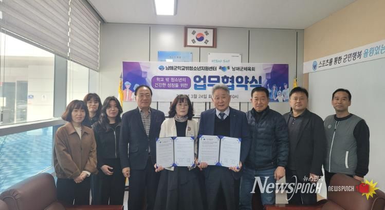 뉴스펀치 박세훈 기자 | 남해군학교밖청소년지원센터는 남해군체육회와 지난 3월24일 학교 밖 청소년의 건강한 성장을 지원하기 위한 업무협약을 체결했다.