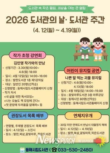 뉴스펀치 조평훈 기자 | 동해시는 2026년 도서관의 날·도서관주간을 기념하여'도서관 속 작은 펼침, 세상을 여는 큰 열림'이라는 공식 주제로 ‘제62회 도서관 주간(4.12.~4.19.)’을 운영한다고 밝혔다.