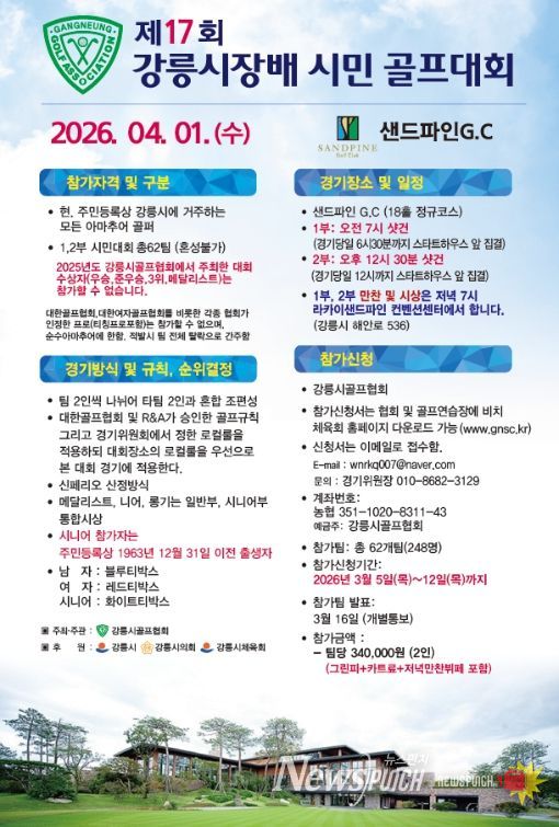 뉴스펀치 조평훈 기자 | 강릉시는 오는 4월 1일 시민 화합과 건강 증진을 위한 '제17회 강릉시장배 시민 골프대회'를 강릉 샌드파인GC에서 개최한다.