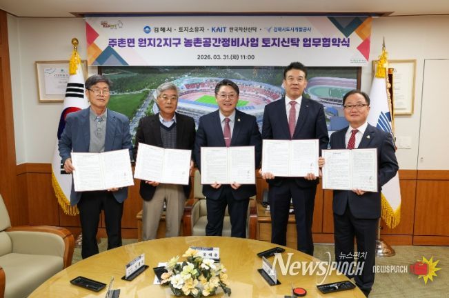 뉴스펀치 박세훈 기자 | 김해시는 주촌면 원지2지구 농촌공간정비사업 추진을 위해 31일 오전 11시 시장실에서 토지소유자, 한국자산신탁(주), 김해시도시개발공사와 함께 토지신탁을 위한 ‘4자 업무협약’을 체결했다.