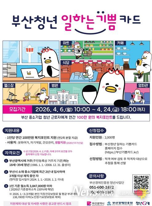 뉴스펀치 김윤걸 기자 | 부산시는 오는 4월 6일부터 4월 24일까지 '2026년 부산 청년 일하는 기쁨카드 지원 사업'에 참여할 청년을 모집한다고 밝혔다.