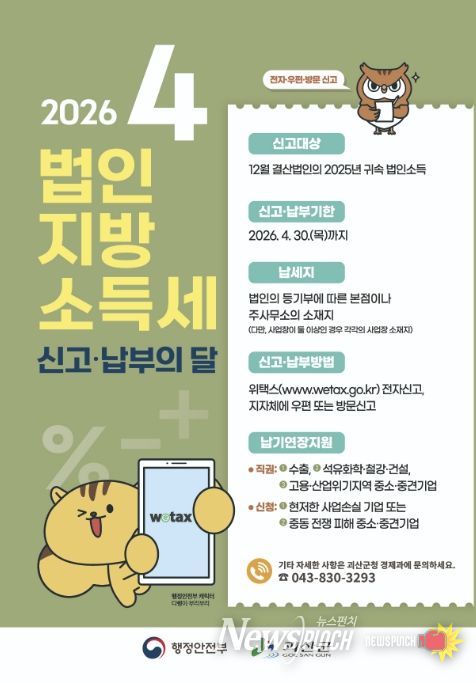 뉴스펀치 이현승 기자 | 충북 괴산군은 오는 30일까지 2025년 귀속 사업연도 소득에 대한 ‘법인지방소득세 집중신고기간’을 운영한다고 1일 밝혔다.