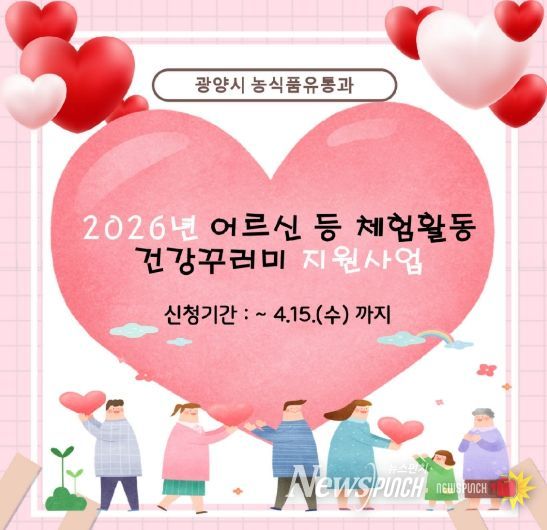 뉴스펀치 최영남 기자 | 광양시가 어르신·장애인·아동 등 실외 활동이 어려운 이용자를 대상으로 ‘체험활동 건강꾸러미 지원사업’을 추진하고, 4월 15일까지 신청을 받는다.