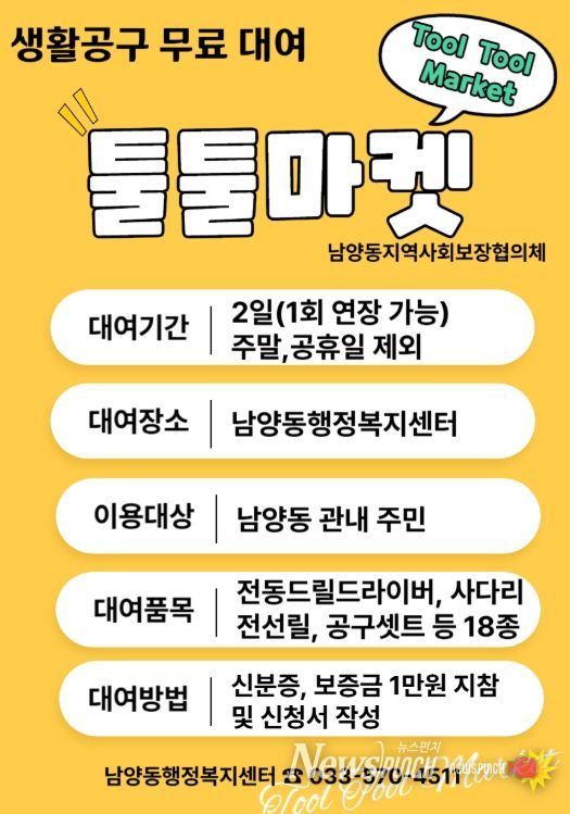 뉴스펀치 조평훈 기자 | 남양동지역사회보장협의체는 일상에서 가끔 사용하는 생활 공구를 남양동 주민에게 무료로 대여해주는 ‘툴툴마켓(Tool Tool Market)’ 운영을 시작했다.