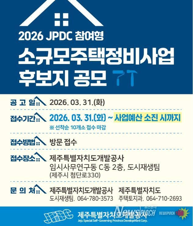 뉴스펀치 김용희 기자 | 제주특별자치도와 제주특별자치도개발공사(사장 백경훈)는 대규모 정비사업 추진이 어려운 노후 주거지의 환경을 개선하고, 양질의 주택공급을 확대하기 위해 작년에 이어 올해에도 ‘JPDC참여형 소규모주택정비사업 신규 후보지 발굴 공모’를 실시한다고 밝혔다.