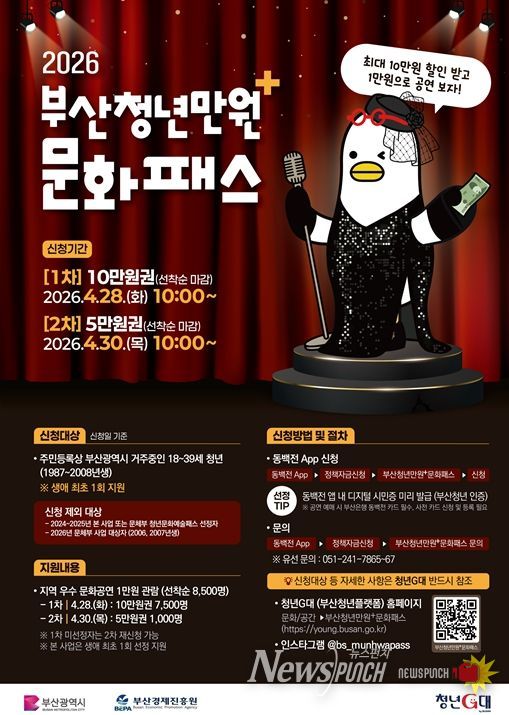 뉴스펀치 김윤걸 기자 | 부산시는 청년들의 높은 호응 속에 지역 대표 청년문화정책으로 자리 잡은 '부산청년만원+문화패스'를 올해 더 확대된 혜택과 개선된 방식으로 본격 시행한다고 밝혔다.