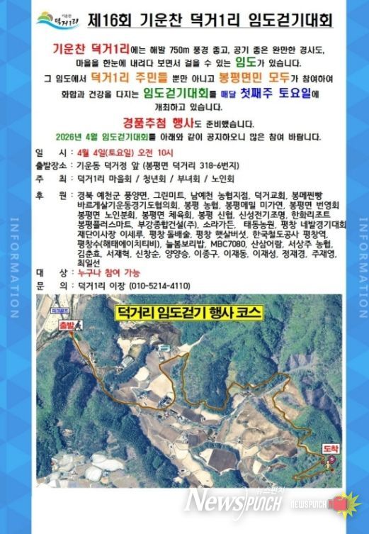 뉴스펀치 조평훈 기자 | 평창군 봉평면 덕거1리(이장 안현태)에서 지역 주민과 방문객이 함께하는'제16회 기운찬 덕거리 임도걷기대회'가 오는 4월 4일 개최된다.