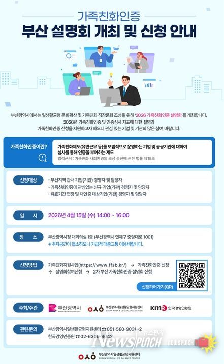 뉴스펀치 김윤걸 기자 | 부산시는 지역기업의 일가정 양립 문화를 확산하고 가족친화 경영 환경 조성을 위한 '2026년 가족친화인증 사업'을 본격적으로 추진한다고 밝혔다.