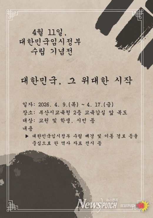뉴스펀치 김윤걸 기자 | 부산광역시교육청은 오는 9일부터 17일까지 교육청 2층 갤러리에서 ‘대한민국, 그 위대한 시작 - 4월 11일, 대한민국임시정부 수립 기념전’을 개최한다고 밝혔다.