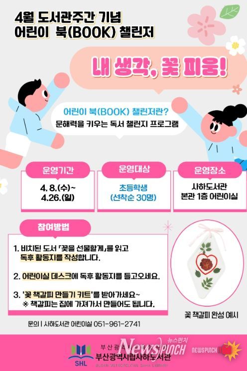 뉴스펀치 김윤걸 기자 | 부산광역시립사하도서관은 오는 8일부터 26일까지 사하도서관 어린이실에서 초등학생 30명을 대상으로 ‘4월 어린이 북 챌린저’를 운영한다.