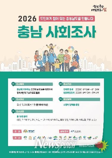 뉴스펀치 이현승 기자 | 청양군이 군민의 삶의 질과 주관적 복지 수준을 파악해 향후 도정 및 군정 운영의 기초 자료로 활용하기 위한 ‘2026 충남사회조사’를 본격 실시한다.