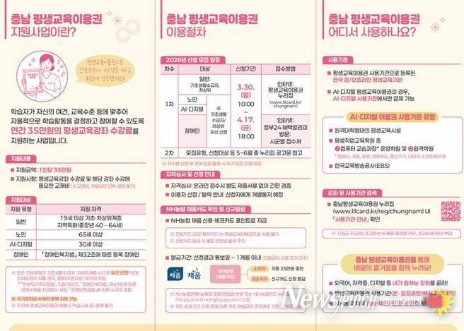 한편, 신청 및 카드발급 등 관련 문의는 충남 평생교육이용권 상담콜센터 또는 누리집 게시판을 통해 확인할 수 있다.