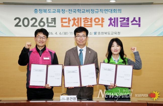 뉴스펀치 이현승 기자 | 충청북도교육청과 전국학교비정규직연대회의'전국공공운수노조 전국교육공무직본부, 전국학교비정규직노동조합'는 6일, 충북교육청 회의실에서 2026년 단체협약을 체결했다.