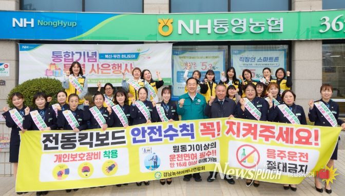 뉴스펀치 박세훈 기자 | 통영시녹색어머니연합회(회장 엄회진)는 지난 3일 북신동 삼성생명 사거리에서 유관기관들과 합동으로 전동킥보드, 전동자전거 등의 개인형이동장치(PM, personality mobility) 등 교통 안전사고 예방 캠페인을 실시했다.