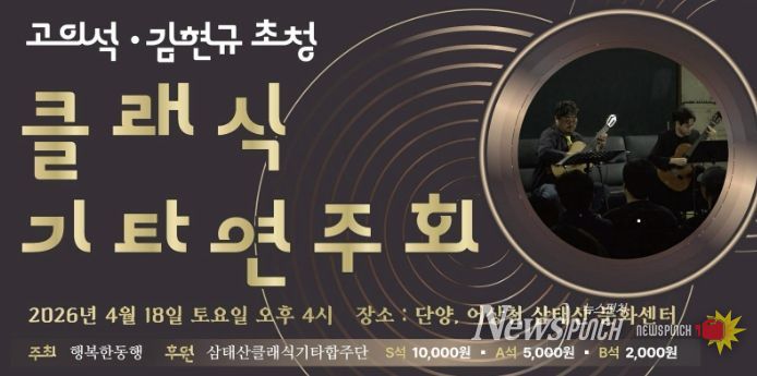 뉴스펀치 이현승 기자 | 단양군 어상천 지역에서 활동하는 삼태산 클래식기타 합주단은 공연기획단체 행복한 동행(대표 홍원의)과 함께 오는 18일 오후 4시 어상천 삼태산문화센터에서 ‘고의석·김현규 초청 클래식기타 연주회’를 개최한다.