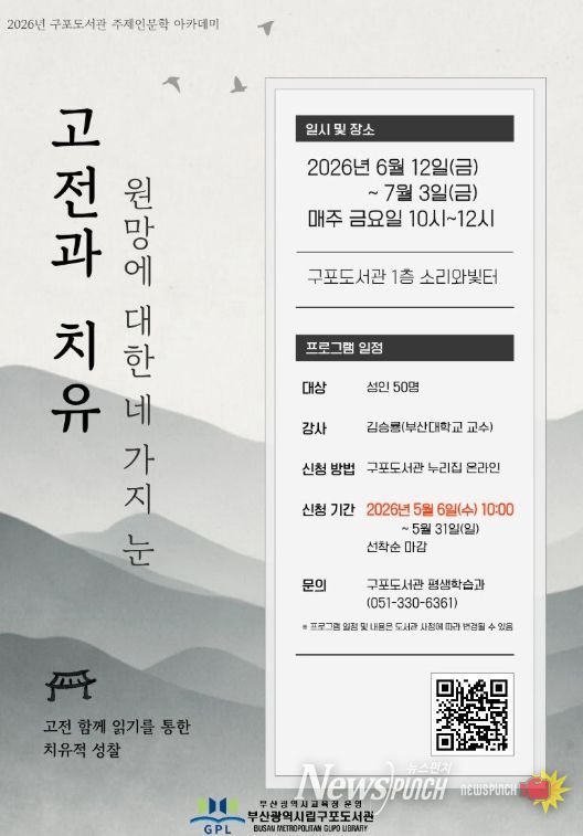 뉴스펀치 김윤걸 기자 | 부산광역시립구포도서관은 오는 5월 6일부터 7월 3일까지 도서관에서 성인 80명을 대상으로 ‘2026년 상반기 주제인문학 아카데미’를 운영한다.