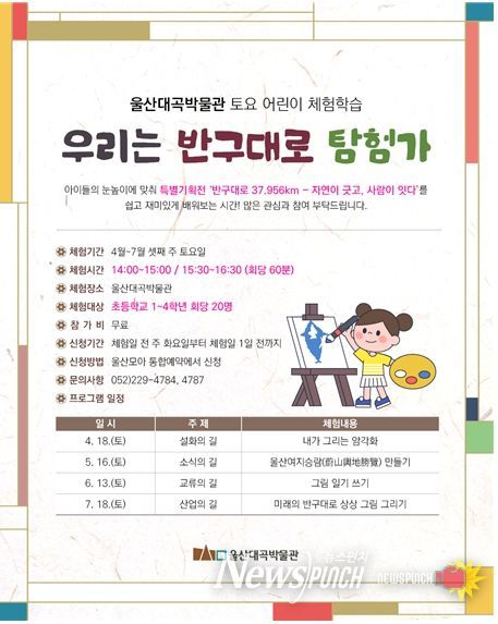 뉴스펀치 김윤걸 기자 | 울산대곡박물관은 어린이 관람객을 대상으로 한 체험학습 ‘우리는 반구대로 탐험가’를 4월부터 7월까지 매월 셋째 주 토요일에 운영한다고 밝혔다.