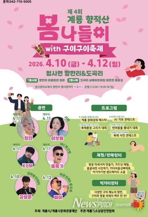 뉴스펀치 이현승 기자 | 계룡시문화관광재단은 4월 10일~12일까지 제4회 ‘계룡 향적산 봄나들이 행사’(이하 ‘봄나들이’)를 개최한다.
