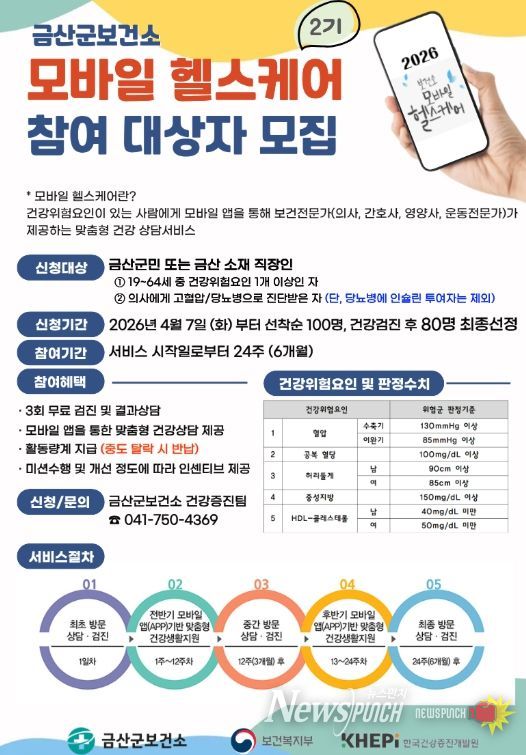 뉴스펀치 이현승 기자 | 금산군보건소는 정보통신기술(ICT)을 활용해 주민들의 만성질환 예방을 돕는 모바일 헬스케어 2기 참여자를 7일부터 모집한다.