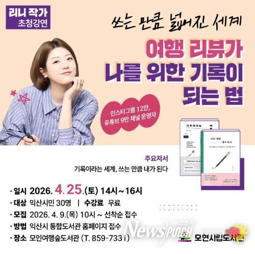 뉴스펀치 정홍균 기자 | 익산시는 모인여행숲도서관에서 개관 1주년과 도서관주간을 맞아 시민 참여형 특화 프로그램으로 '리니 작가 초청강연'을 운영한다고 7일 밝혔다.