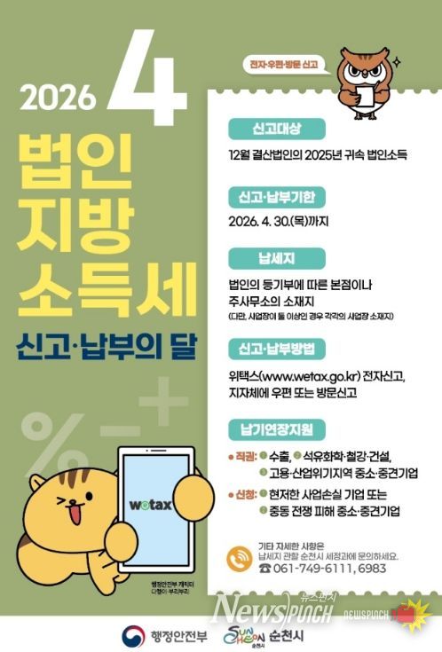 뉴스펀치 조평훈 기자 | 순천시는 4월 한 달을 법인지방소득세 집중 신고·납부 기간으로 운영하며, 관내 법인들은 4월 30일까지 신고·납부를 완료해 줄 것을 당부했다.