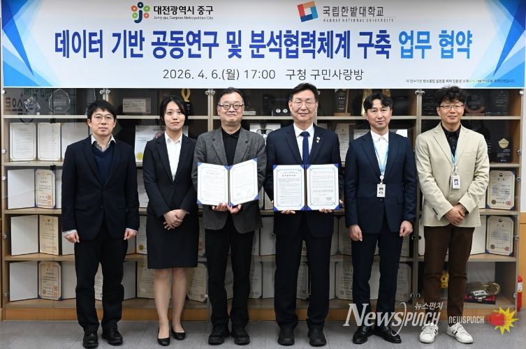 뉴스펀치 이현승 기자 | 대전 중구는 지난 6일 국립한밭대학교와 중구청 구민사랑방에서 ‘데이터 기반 공동연구 분석 협력 체계 구축을 위한 업무협약’을 체결했다고 밝혔다.