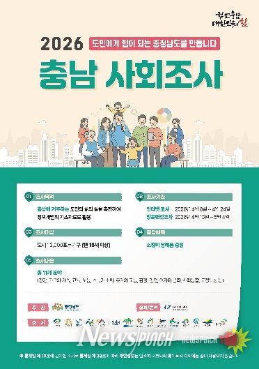 뉴스펀치 이현승 기자 | 천안시는 충청남도와 함께 내달 4일까지 시민의 사회적 상태를 측정해 정책 방향을 제시하는 ‘2026 충남 사회조사’를 실시한다고 8일 밝혔다.