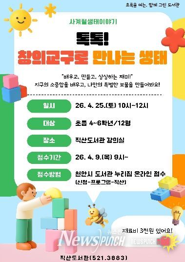 뉴스펀치 이현승 기자 | 천안시 직산도서관은 오는 25일 ‘톡톡! 창의교구로 만나는 생태’를 운영한다고 8일 밝혔다.