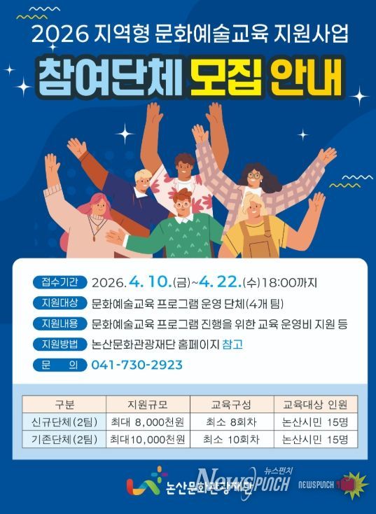 뉴스펀치 이현승 기자 | 논산문화관광재단은 지역 문화시설과 자원을 활용한 지속가능한 문화예술교육 기반 구축을 위해 ‘2026 지역형 문화예술교육 지원사업’ 운영단체를 공개 모집한다.