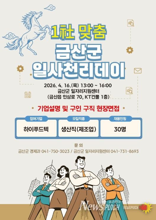 뉴스펀치 강영선 기자 | 금산군은 오는 16일 오후 1시부터 4시까지 금산읍 케이티KT) 건물 소재 금산일자리지원센터에서 1사(社) 맞춤 일사천리데이 현장 면접을 개최한다.