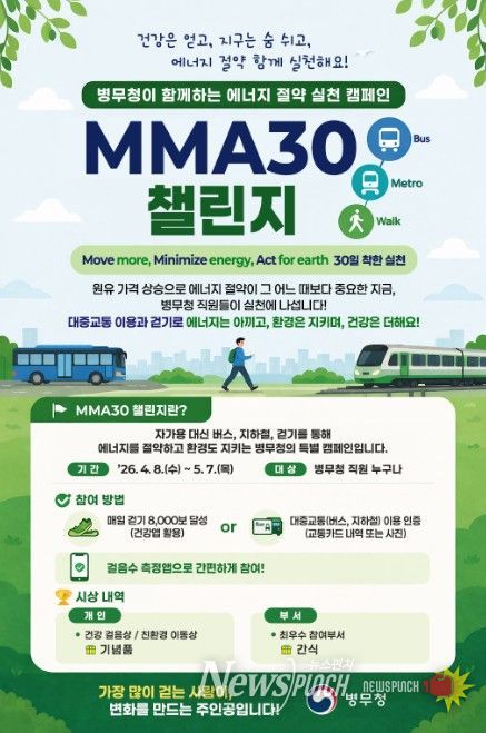 뉴스펀치 정홍균 기자 | 병무청은 최근 원유 가격 상승으로 에너지 절약에 대한 관심이 높아진 가운데 전 직원이 동참하는 'MMA30 챌린지' 실천 운동을 진행한다.