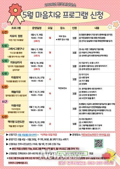 현재 오는 5월 운영될 마음치유 프로그램에 참여할 시민들의 참여 신청을 선착순 모집 중으로, 참여를 원하는 시민은 전주시 마음건강이야기 블로그 또는 전화로 문의하면 된다.