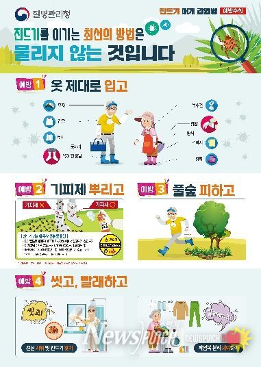 구체적인 예방법은 ▲ 진드기 노출을 최소화할 수 있는 복장 갖춰 입기(밝은 색 긴옷, 모자, 손수건, 목이 긴 양말, 장갑 등) ▲ 진드기 기피제와 돗자리 사용하기 ▲풀 위에 옷 벗어놓거나 풀밭에서 용변보지 않기 ▲ 귀가 시 전신 샤워 및 작업복 분리 세탁하기 등이다.