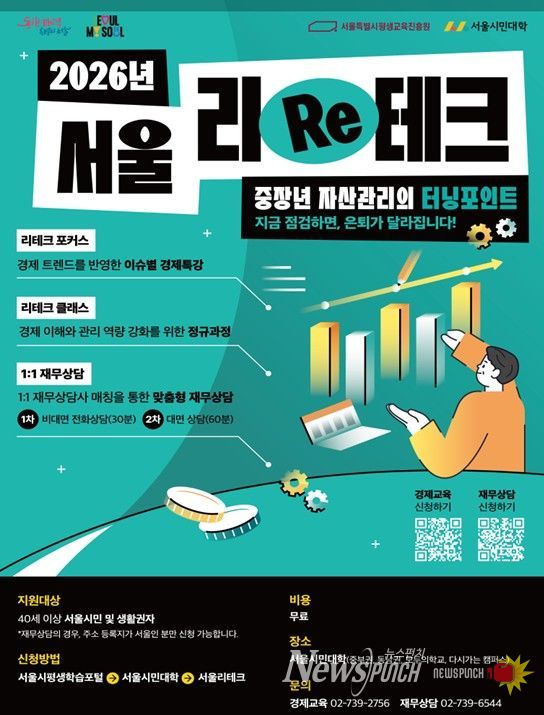뉴스펀치 박상훈 기자 | 서울시가 고물가·고금리 등 경제환경 변화 속에서 중장년층의 안정적인 자산관리와 은퇴 설계를 지원하기 위해 ’26년 서울 리(Re)테크’를 본격 추진한다. 서울 리(Re)테크는 40세 이상 서울 시민을 대상으로 맞춤형 경제교육과 재무 상담을 무료로 제공하는 사업이다