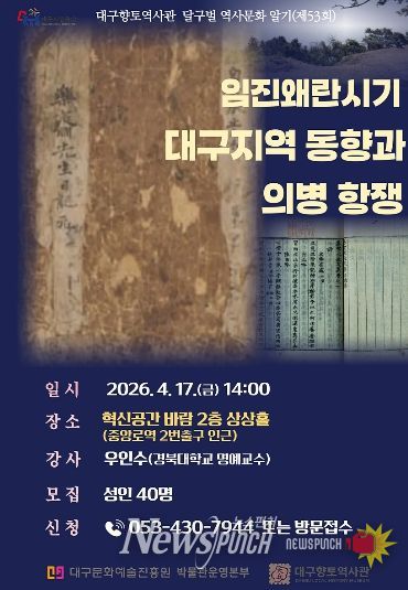뉴스펀치 조평훈 기자 | 대구문화예술진흥원 박물관운영본부 소속 대구향토역사관은 2026년 대구시민주간 연계 프로그램으로 ‘임진왜란시기 대구지역 동향과 의병 항쟁’을 주제로 4월 17일 2시에 전문가 특강을 개최한다.