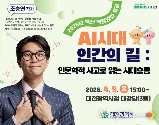 뉴스펀치 이현승 기자 | 대전시는 9일 오후 시청 대강당에서 『AI 시대 인간의 길』을 주제로, 베스트셀러 저자이자 인문학 크리에이터인 조승연 작가를 초청해 ‘2026년 상반기 혁신 역량강화 특강’을 개최했다.