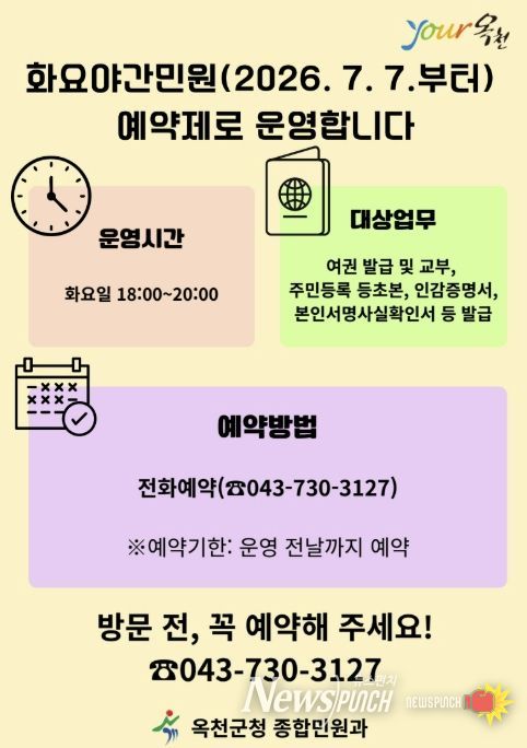 뉴스펀치 이현승 기자 | 옥천군은 화요야간민원실 운영의 효율성을 높이고 군민의 불필요한 대기와 재방문을 줄이기 위해 오는 7월 7일부터 예약제로 전환해 운영한다고 밝혔다.