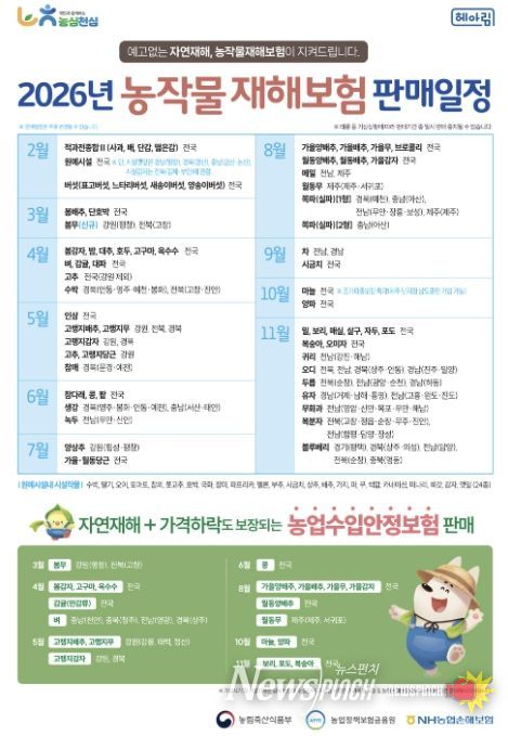 홍성군 관계자는 “최근 기후변화로 농작물 피해 위험이 갈수록 커지고 있어 재해보험은 선택이 아닌 필수”라며 “가입 기간이 품목별로 상이한 만큼 지역 농협 등을 통해 사전에 확인하고 반드시 기간 내 가입해 달라”고 당부했다.