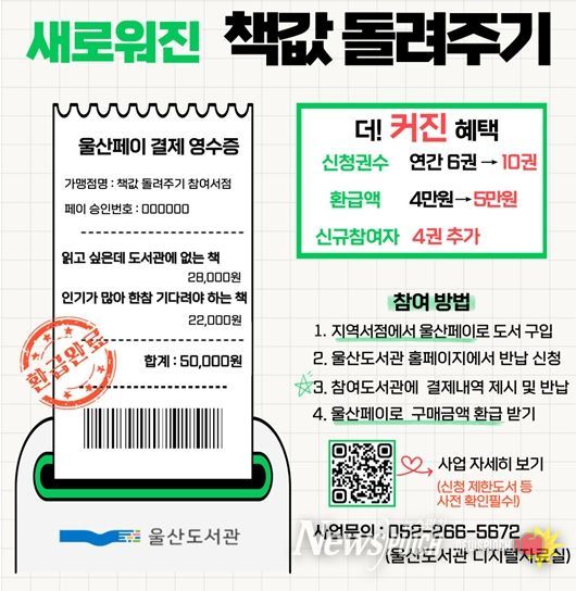 울산도서관 관계자는 “도서관과 지역서점은 책을 통해 시민들이 서로의 취향을 확인하고 영감을 나누는 가장 힙(Hip)한 거점(아지트)”이라며, “올해 새롭게 단장한 책값 돌려주기 사업이 시민들에게 단순한 비용 지원을 넘어, ‘인생 책’을 발견하는 소중한 경험이 되길 기대한다”라고 말했다.