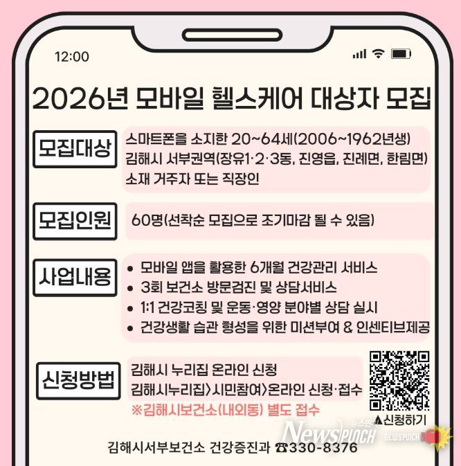 뉴스펀치 박세훈 기자 | 김해시서부보건소는 지역주민의 건강생활 실천과 만성질환 예방을 위해 ‘모바일 헬스케어사업’참여자 60명을 모집한다고 밝혔다.