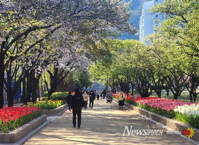 뉴스펀치 박세훈 기자 | 완연한 봄기운 속에 김해시 연지공원과 대청천·율하천 수변공원의 만개한 튤립이 상춘객들의 발길을 사로잡고 있다.