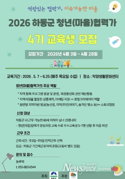 뉴스펀치 박세훈 기자 | 하동군은 지역 활력 회복과 청년 일자리 창출을 위해 추진 중인 ‘청년(마을)협력가 양성과정’의 제4기 교육생을 오는 4월 28일까지 모집한다고 밝혔다.