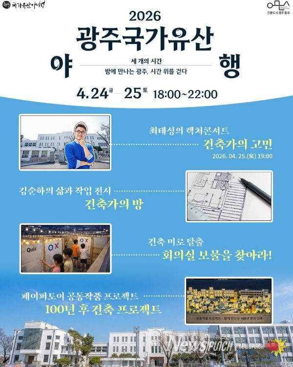 뉴스펀치 김용희 기자 | 광주 동구는 오는 24~25일 5·18 민주광장 일원에서 열리는 ‘2026 광주 국가유산 야행’에서 옛 전남도청을 중심으로 근대 건축유산의 가치와 의미를 조명하는 다양한 프로그램을 운영한다고 밝혔다.