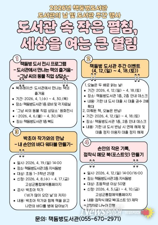 뉴스펀치 박세훈 기자 | 책둠벙도서관은 제62회 도서관 주간을 맞아 지역 주민의 독서 문화 활성화와 도서관 이용 증진을 위해 다양한 행사를 운영한다.