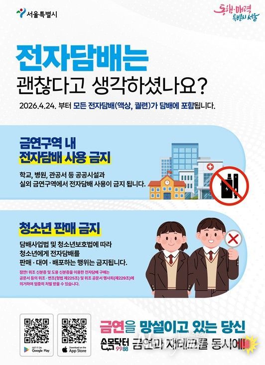 뉴스펀치 박상훈 기자 | 4월 24일부터는 담배사업법 개정·시행에 따라 액상형 전자담배 포함 모든 종류의 담배를 금연구역에서 흡연할 경우, 과태료가 부과된다. 이에 서울시는 개정 사항을 시민에게 적극적으로 안내하는 한편, 현장 점검을 본격 추진한다고 밝혔다.