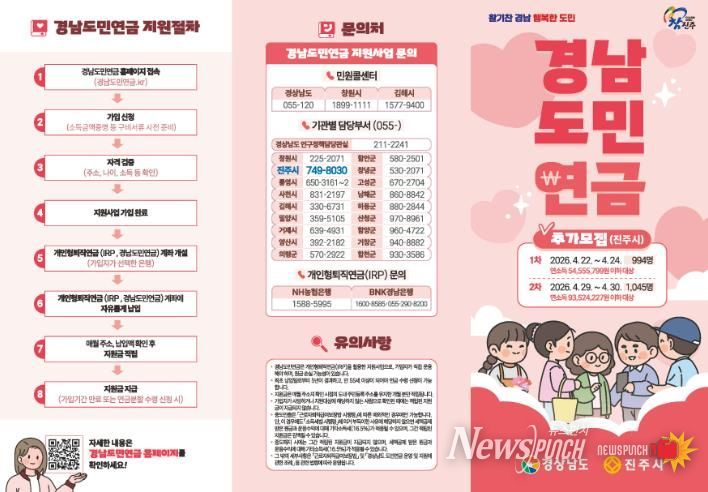 뉴스펀치 박세훈 기자 | 진주시는 지난 1월 ‘경남도민연금’ 모집 당시 접수 2일 만에 모집 인원 1001명이 조기 마감되는 등 시민들의 높은 정책 수요와 지속적인 추가 모집 요청을 적극 반영해 오는 22일부터 2039명 규모의 추가 모집을 시행한다고 밝혔다.