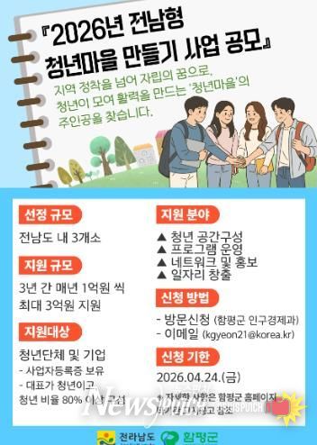 뉴스펀치 김용희 기자 | 전남 함평군이 ‘2026년 전남형 청년마을 만들기 지원사업’에 참여할 청년단체를 이달 24일까지 공개 모집한다.